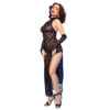 Unos elegantes guantes de encaje completan el look, aportando sofisticación y misterio.