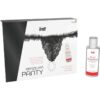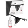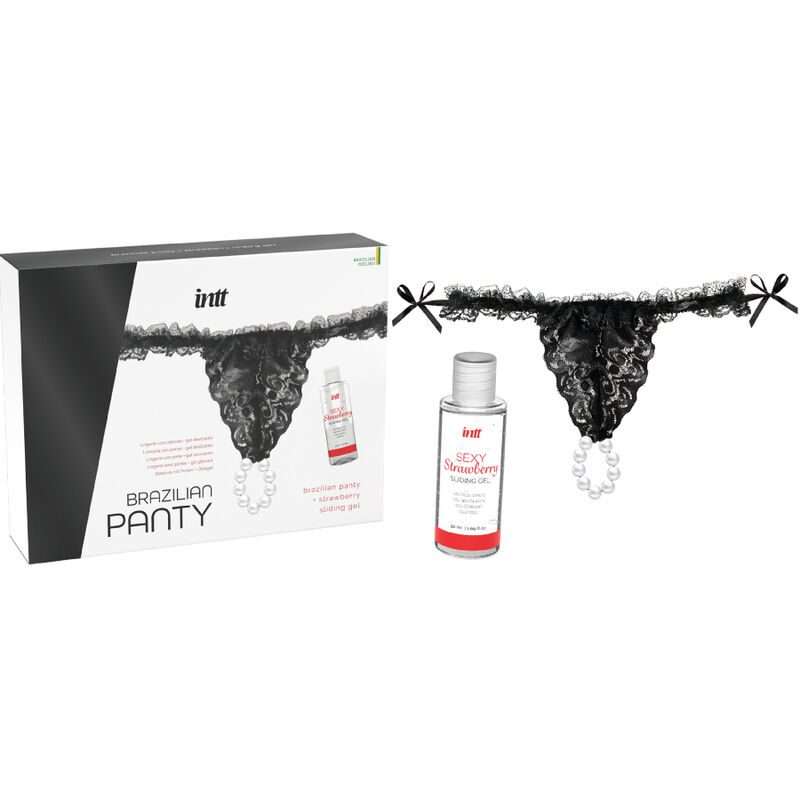 Brazilian Panty Black de INTT es un sensual pack de lencería con perlas acompañado de un gel a base de agua con sabor a fresa.