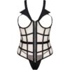 Un conjunto de dos piezas compuesto por un sensual corsé con el pecho al descubierto y un sexy tanga negro. El corsé tiene una cremallera en la parte delantera, lo que facilita su colocación. Los colores del conjunto son el negro y el beige, que juntos crean una atractiva combinación. También vale la pena prestar atención a detalles tentadores como un cuello negro o cinturones negros dispuestos de tal manera que realcen mejor la cintura. Lo que más destaca de este corsé son los recortes que exponen el busto. Esto hace que todo el conjunto sea muy atrevido y provocativo. No queda mucho a la imaginación. Las pegatinas para pezones serán una gran adición al juego y agregarán algo de sabor.