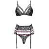 Un conjunto de lencería exclusivo y elegante confeccionado con un intrincado encaje negro. Un coqueto sujetador de finos tirantes que se cruzan en la espalda, decorado con tirantes y bisutería plateada. Elegante liguero atado en la espalda con una cinta de raso. Un adorno adicional son dos cintas de flores rosas. El set incluye un tentador tanga con un pequeño corazón plateado.
